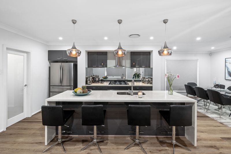 • The kitchen is a chef's delight, offering extensive bench space and storage, a large breakfast bar, quality appliances, and a 6-burner gas cooktop. It is complemented by a functional butler's pantry