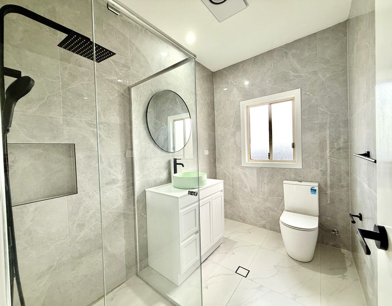 * Sleek, modern bathroom with floor to ceiling tiles and premium fittings