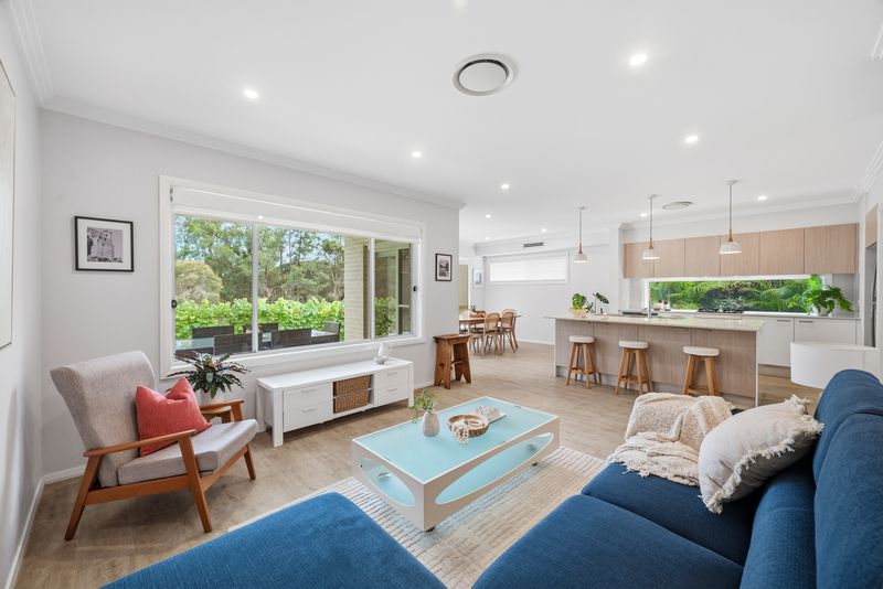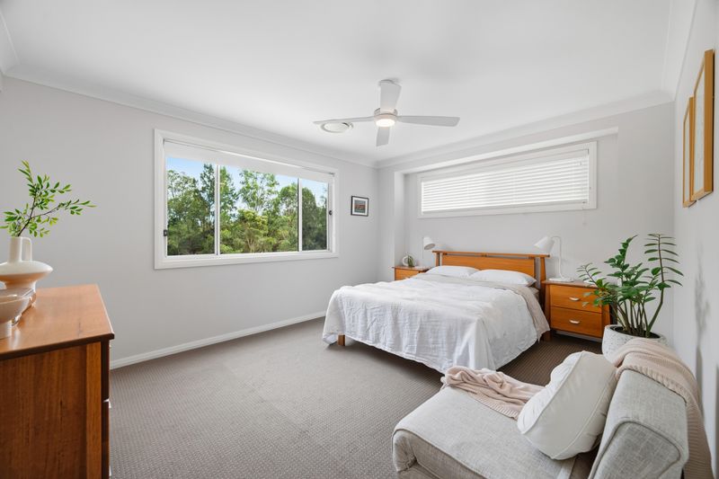The ground level features an open plan layout encompassing a main lounge and a generous family and dining area that flows seamlessly into the state of the art kitchen. The kitchen is designed for entertaining, complete with a stone island bench, modern timber accents, gas cooking, stainless steel appliances and a feature window offering views of the greenery. The living spaces open directly to a covered patio and a private backyard, ideal for year round alfresco dining. Upstairs, the home provides four comfortable bedrooms, 3 with built in robes and a master suite with a walk in robe, private ensuite and views overlooking the estate's natural reserve and scenic fountain.