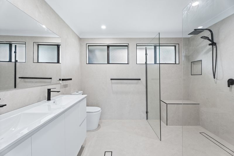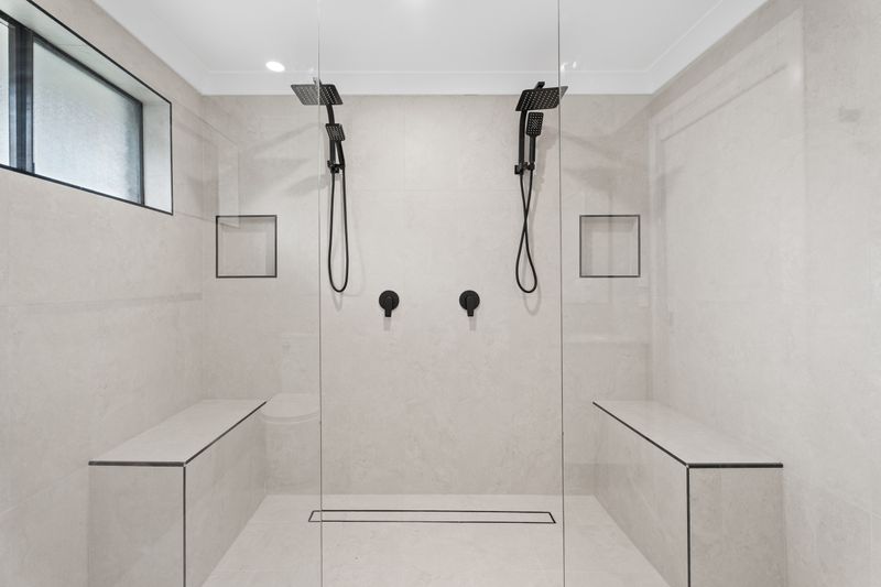 • Stylish main bathroom complete with his & hers vanity, modern shower, floor-to-ceiling tiles and contemporary fixtures.