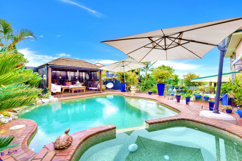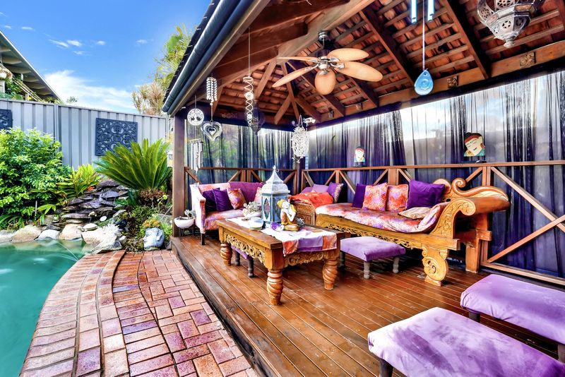 • Stylish cabana complete with outdoor fan and blind shades, securely enclosed by glass fencing