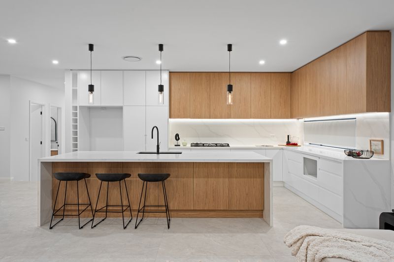 • Gourmet Chef's Kitchen: Boasts a massive stone island breakfast bar with waterfall edges, sleek handleless cabinetry, and premium gas cooking.