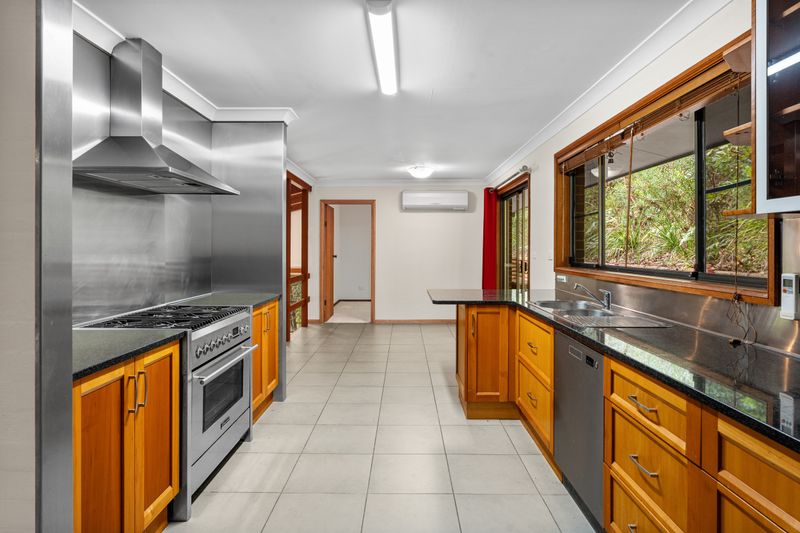 The home's multi-level is designed to accommodate large-scale living, featuring a versatile floor plan with five bedrooms plus a dedicated rumpus room. The expansive living room serves as the heart of the home, boasting ceilings with exposed timber beams. The kitchen is a chef's delight, equipped with professional-grade stainless steel appliances, extensive stone benchtops, and a seamless connection to the dining area. For those who enjoy the outdoors, the property offers a wraparound balcony and a private rear patio, both of which overlook the vast, lush greenery of the estate.