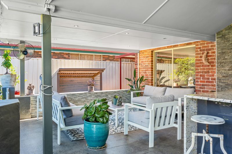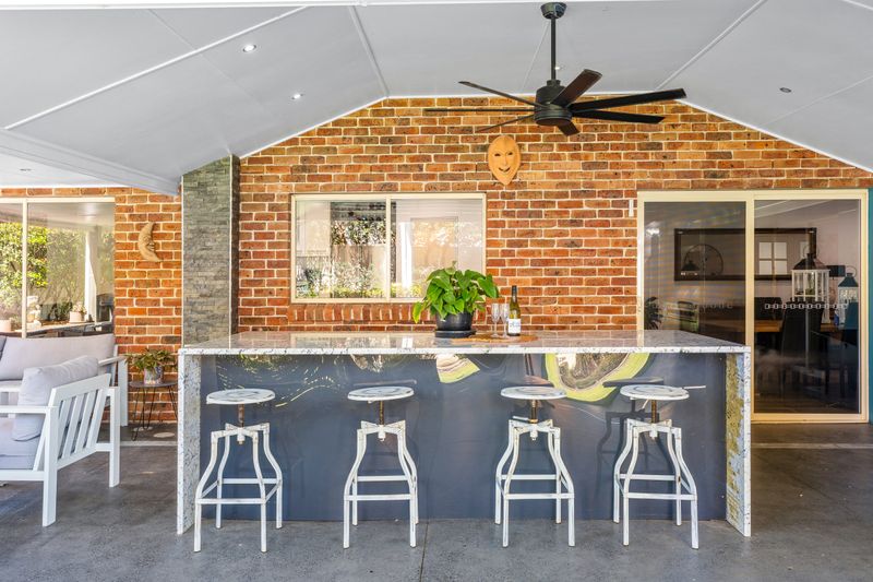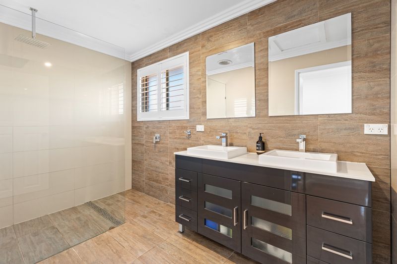 The home features four spacious bedrooms, each enhanced with mirrored built-in wardrobes, ceiling fans, and plantation shutters, ensuring both comfort and timeless style. A versatile fifth bedroom currently serves as a study, providing the perfect space for a home office or quiet retreat. Ducted air conditioning services the home throughout, delivering year-round climate control.