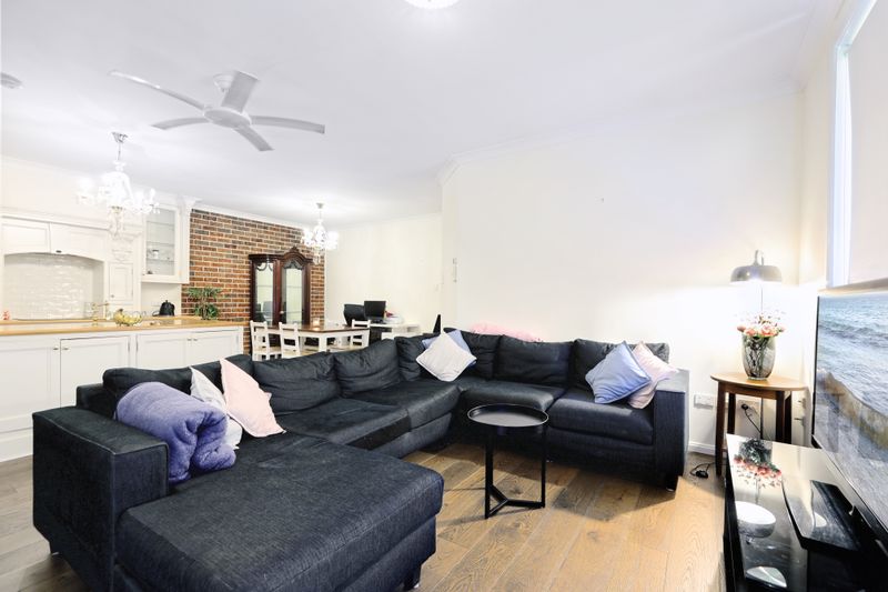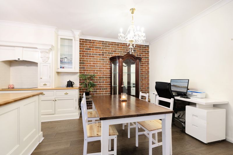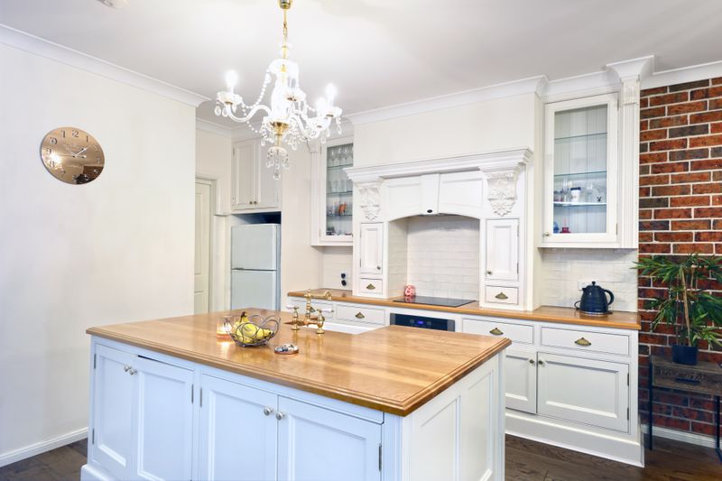 The heart of the home is a stunning, light-filled open-plan living area that seamlessly connects the kitchen, dining, and lounge spaces. The gourmet kitchen is a standout feature, boasting elegant white cabinetry with ornate detailing, rich timber benchtops, and a statement chandelier that adds a touch of luxury to your daily meal preparation. High-quality finishes like the farmhouse-style sink and integrated appliances are complemented by a warm brick feature wall that carries the home's exterior charm inside.