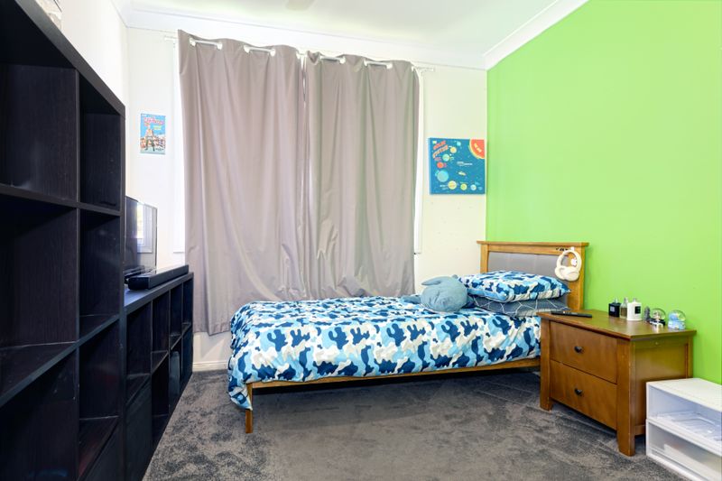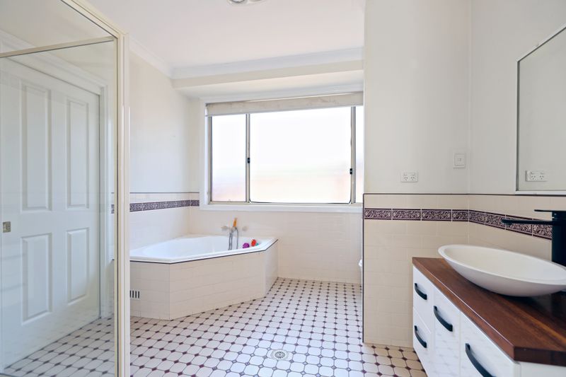 The master bedroom serves as a bright and airy retreat, complete with expansive mirrored built-in wardrobes and split-system air conditioning for year-round comfort. Additional bedrooms are generously sized and versatile, including a vibrant secondary room perfect for children. The central bathroom is impressively spacious, featuring a deep corner soaking tub, a modern floating vanity with timber accents, and classic tiling.