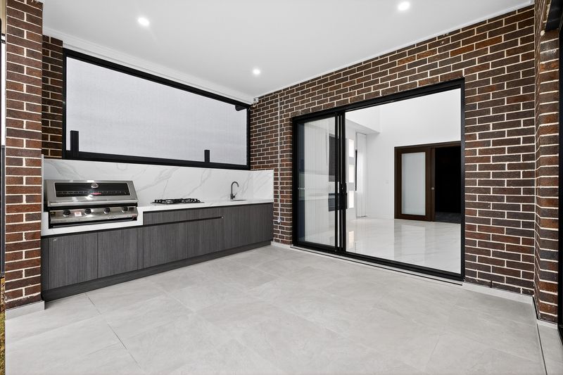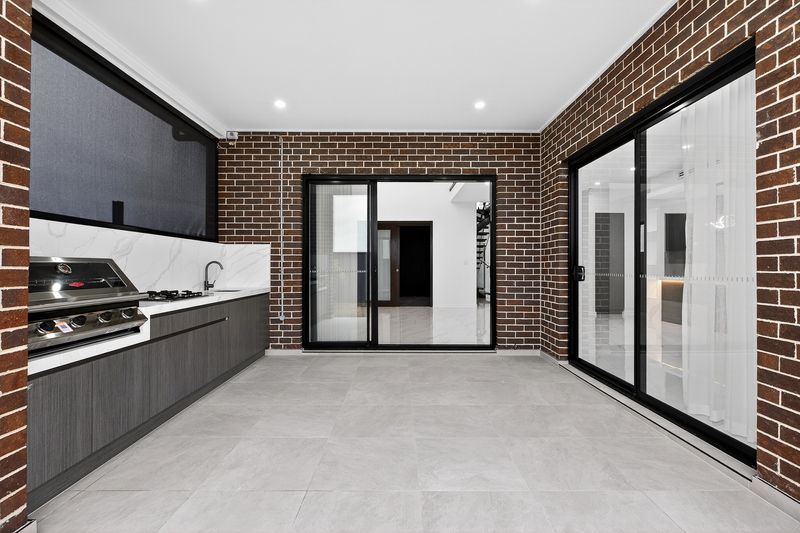 The heart of the home is a gourmet chef's sanctuary, where dark timber grained cabinetry meets the timeless beauty of stone waterfall bench tops. This space is further elevated by premium integrated appliances, gas cooking for the serious home chef, a sleek butler's pantry, and a feature window splash back that invites natural light to dance across the polished porcelain floor tiles. The open plan living and dining areas transition seamlessly through expansive glass sliding doors to a covered patio entertaining zone, complete with a built-in outdoor kitchen and barbecue, all framed by the rustic charm of exposed brickwork.