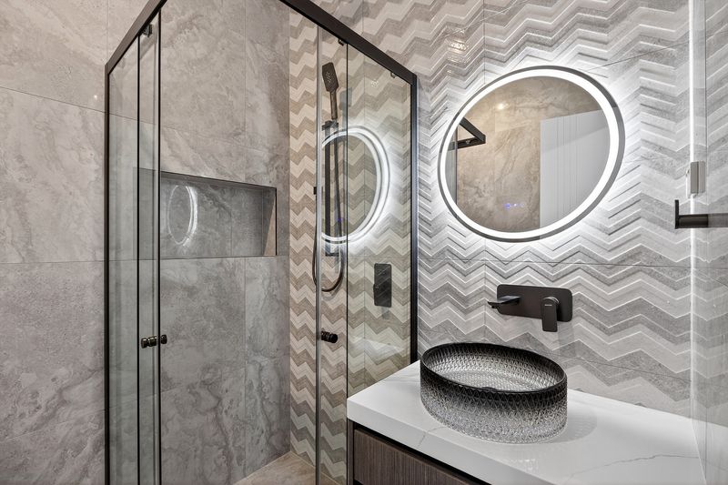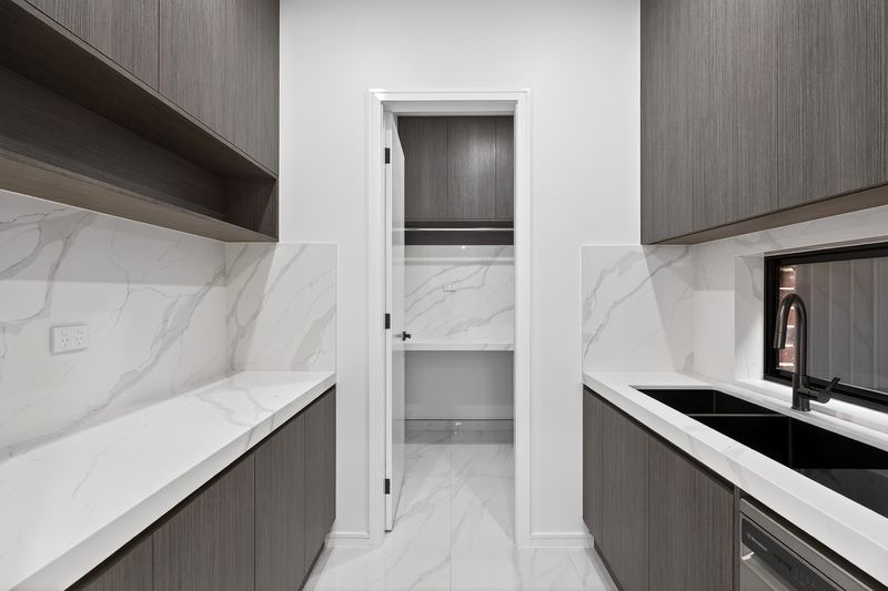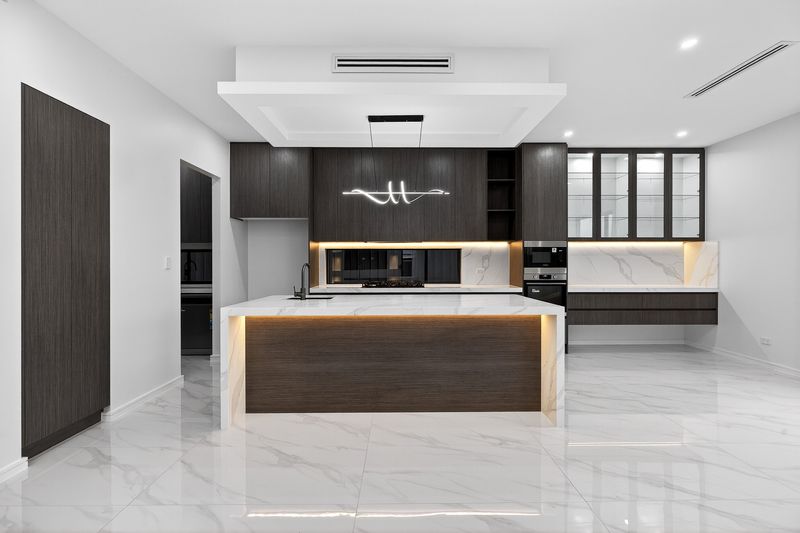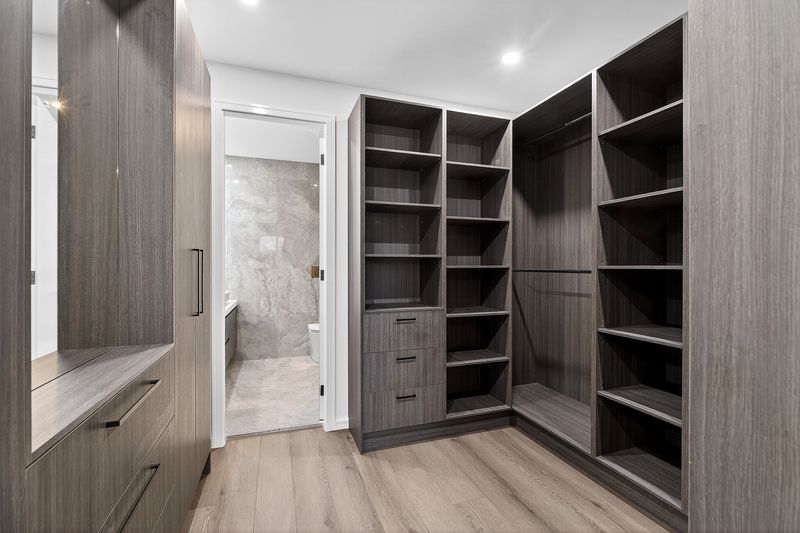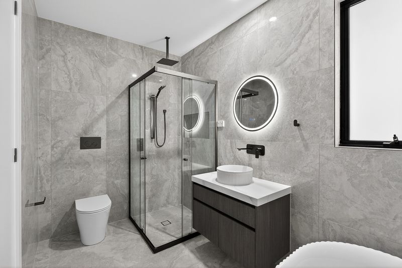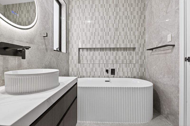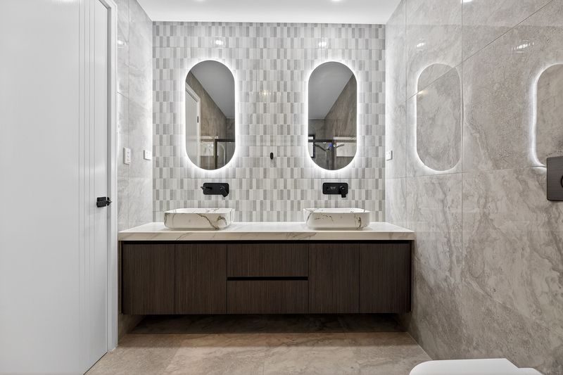 Every comfort has been considered, with ducted air conditioning and stylish ceiling fans throughout to ensure year round climate control. Each bathroom, is a study in texture and tone, showcasing floor to ceiling stone look tiles, fluted freestanding bathtubs, and dual vanities illuminated by backlit mirrors. The ground floor also features a thoughtfully placed powder room, ensuring convenience for guests and residents alike. High end finishes continue into the double garage, which features a high gloss epoxy finish.