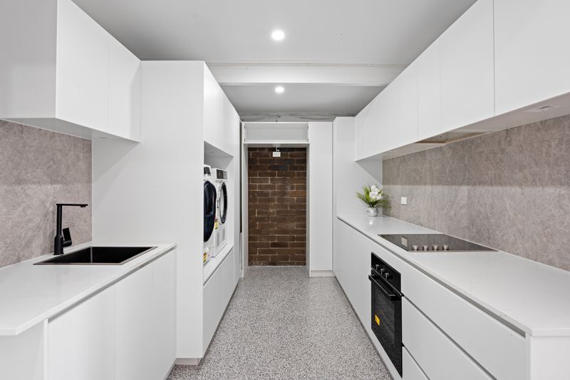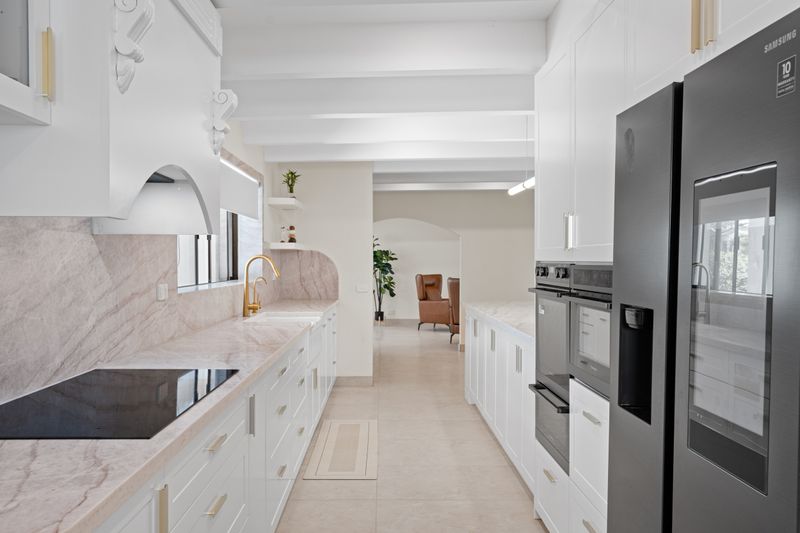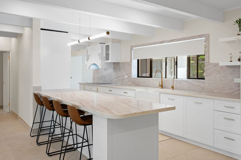 The kitchen is anchored by breathtaking 40mm Taj Mahal stone bench tops that wrap into an elegant waterfall island, complemented perfectly by custom polyurethane shaker cabinetry. This space features a double wall oven alongside a specialised oven and microwave combination unit, Integrated seamlessly into the design is a premium SMEG dishwasher.