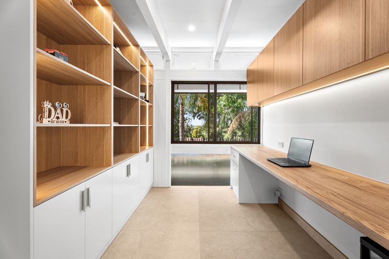 The ground floor transition is defined by the massive 1200x600 floor tiles that create a sense of seamless flow and light throughout the primary living zones. Here, the home provides an atmosphere for every season, you can enjoy the instant ambiance of the sleek electric fireplace during modern gatherings or retreat to the authentic warmth of the traditional wood fireplace on those crisp winter evenings. The residence includes a full executive office fit-out, providing a dedicated and organised environment for productivity.