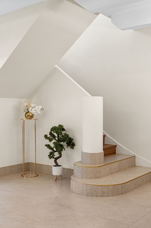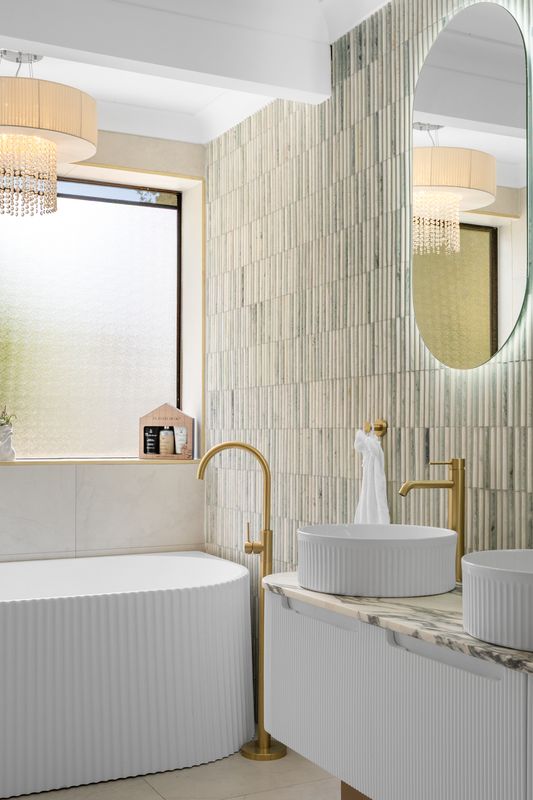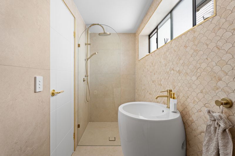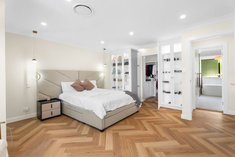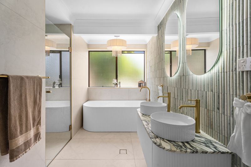 Ascending to the first floor, the design shifts to a warmer, more intimate feel with high-quality herringbone hybrid flooring . The bathrooms on this level are true showpieces, featuring striking marble feature walls that elevate the space into a private spa retreat. Every detail, from the fluted freestanding bathtub to the designer gold hardware and dual sinks, has been selected to provide a daily experience of indulgence.