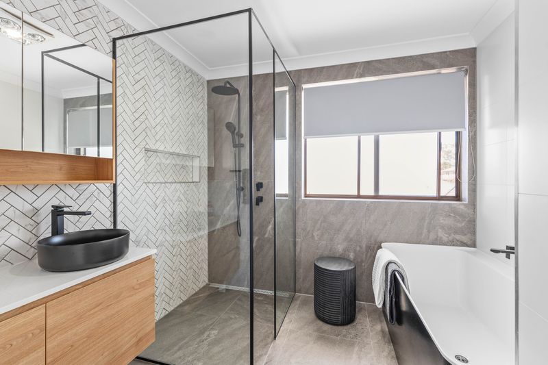 • Main bathroom finished with spectacular floor-to-ceiling feature tiling, a full-size vanity, bathtub, and large shower with detachable head