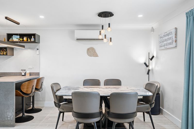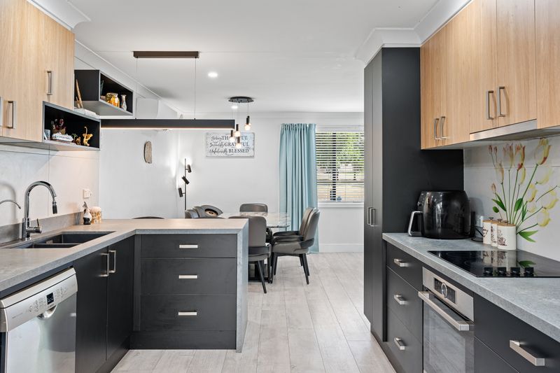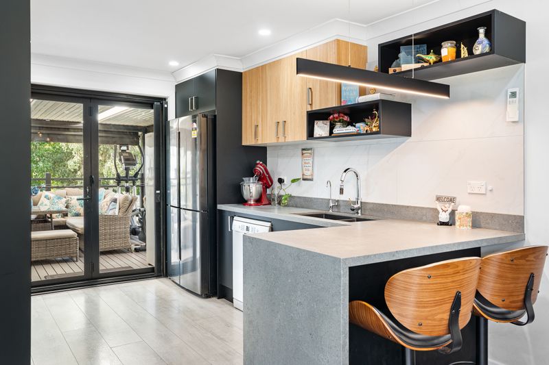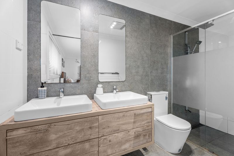 At the heart of the home sits the impressive modern kitchen, featuring sleek stone benchtops, ample storage, premium finishes, and a spacious breakfast bar perfect for casual dining and entertaining. Both bathrooms have been renovated to an exceptional standard, offering elegant design and functionality for busy families.