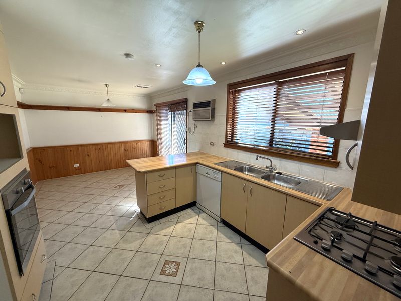 Spacious kitchen with ample storage and bench space, meals area off kitchen, dishwasher and gas cooking