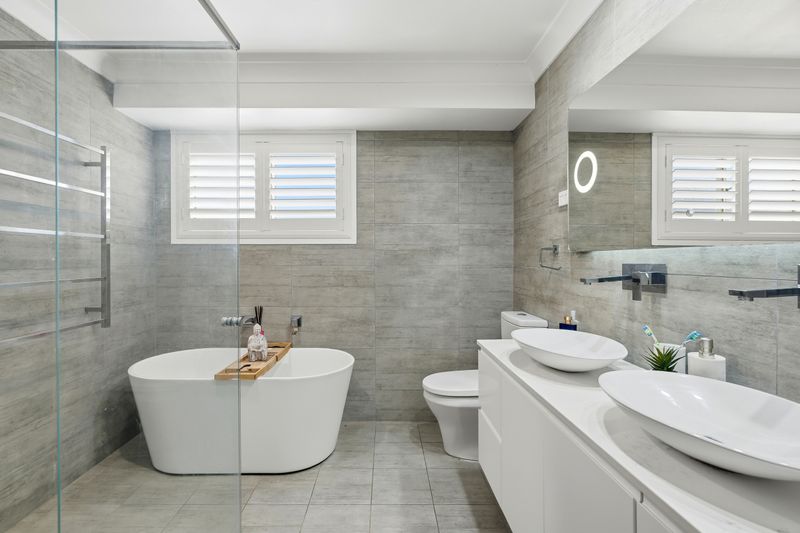 • Stylish main bathroom featuring a freestanding bath, walk-in shower, floor-to-ceiling tiles and floating vanity with dual sinks.