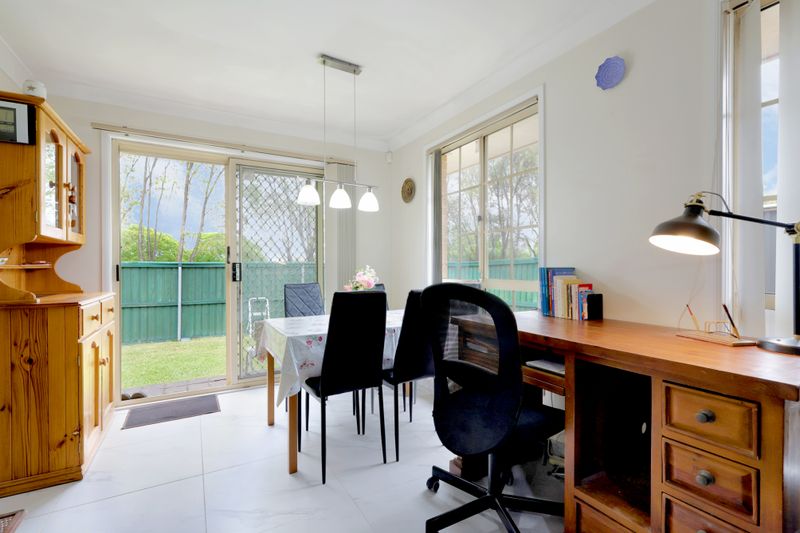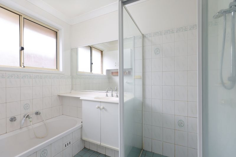 Inside, the home features a modern kitchen with white cabinetry and dark tiled splashbacks, a standalone oven, and a double sink positioned beneath a window with a pleasant outdoor view. The main living space is bright and inviting, featuring light coloured tiled flooring and a ceiling fan for comfort, easily accommodating the large black leather sofa and accent chair shown. The separate dining area, currently utilised as a combined dining and home office space, opens via glass sliding doors onto the backyard. The main bedroom is a comfortable retreat with a timber bedframe, timber flooring, and a ceiling fan, benefitting from large windows that fill the room with natural light. The bathroom is classic, featuring white wall tiles with a decorative border, a full bathtub, and a separate glass enclosed shower.