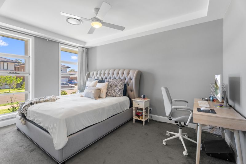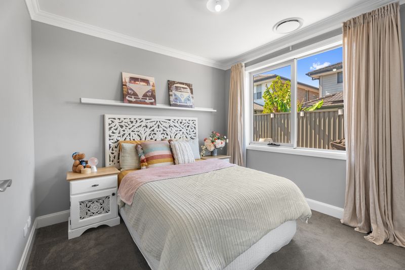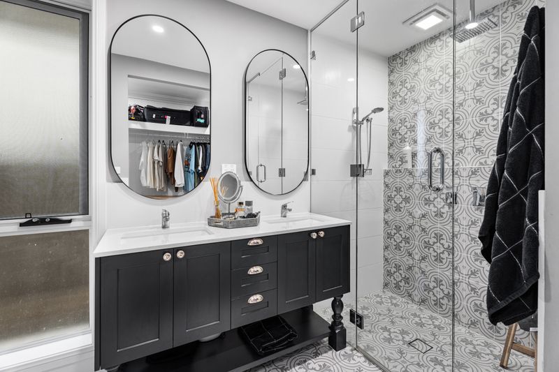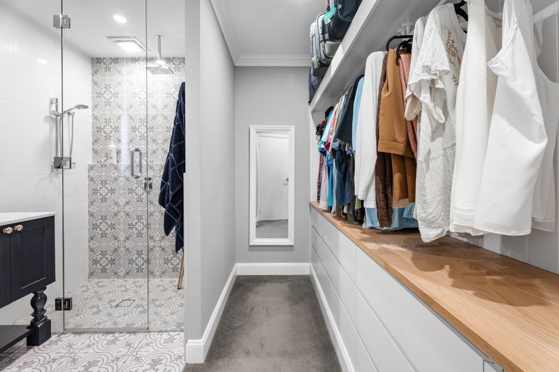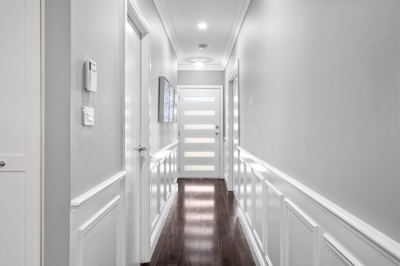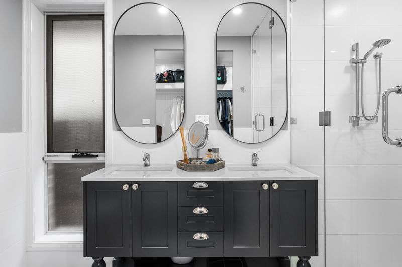 The master suite is a true parents' retreat, featuring double entry, custom walk-in wardrobes with overhead storage and a fully bespoke ensuite. Enjoy luxury with ceiling to floor tiled shower, custom glass, rain head plus dual shower heads and high-end polished nickel hardware throughout.