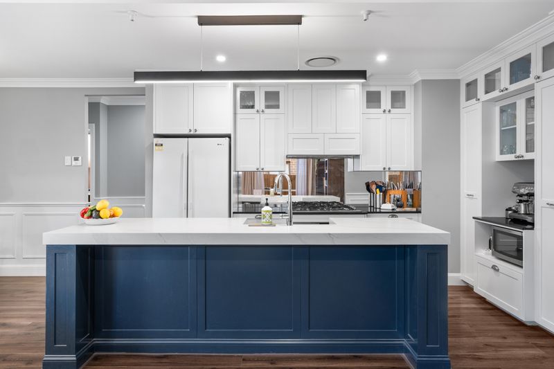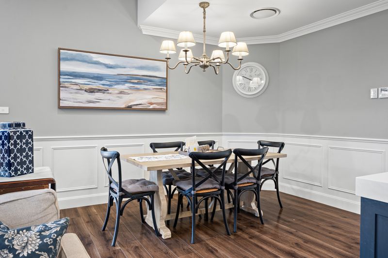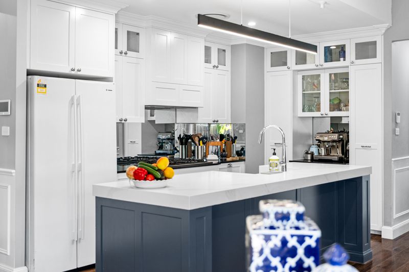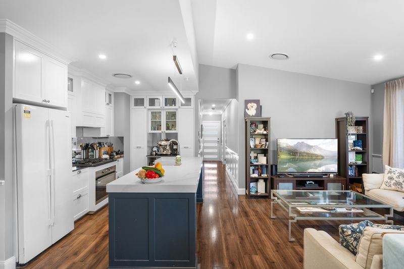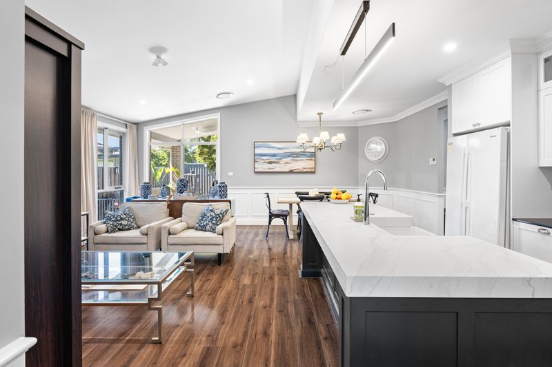 At the heart of the home is a stunning fully custom kitchen, designed to impress and perform. Featuring rich hickory flooring, 80mm benchtops, a custom island with integrated rubbish bins, French-style farmhouse (barn) sink and classic shaker-style cabinetry with soft-close finishes. The space is elevated by a striking mirror splashback, built-in slide-out pantries, hidden storage solutions, and a dedicated coffee and bar station. A 900mm gas stove and oven anchors the kitchen, making it ideal for both everyday living and entertaining.